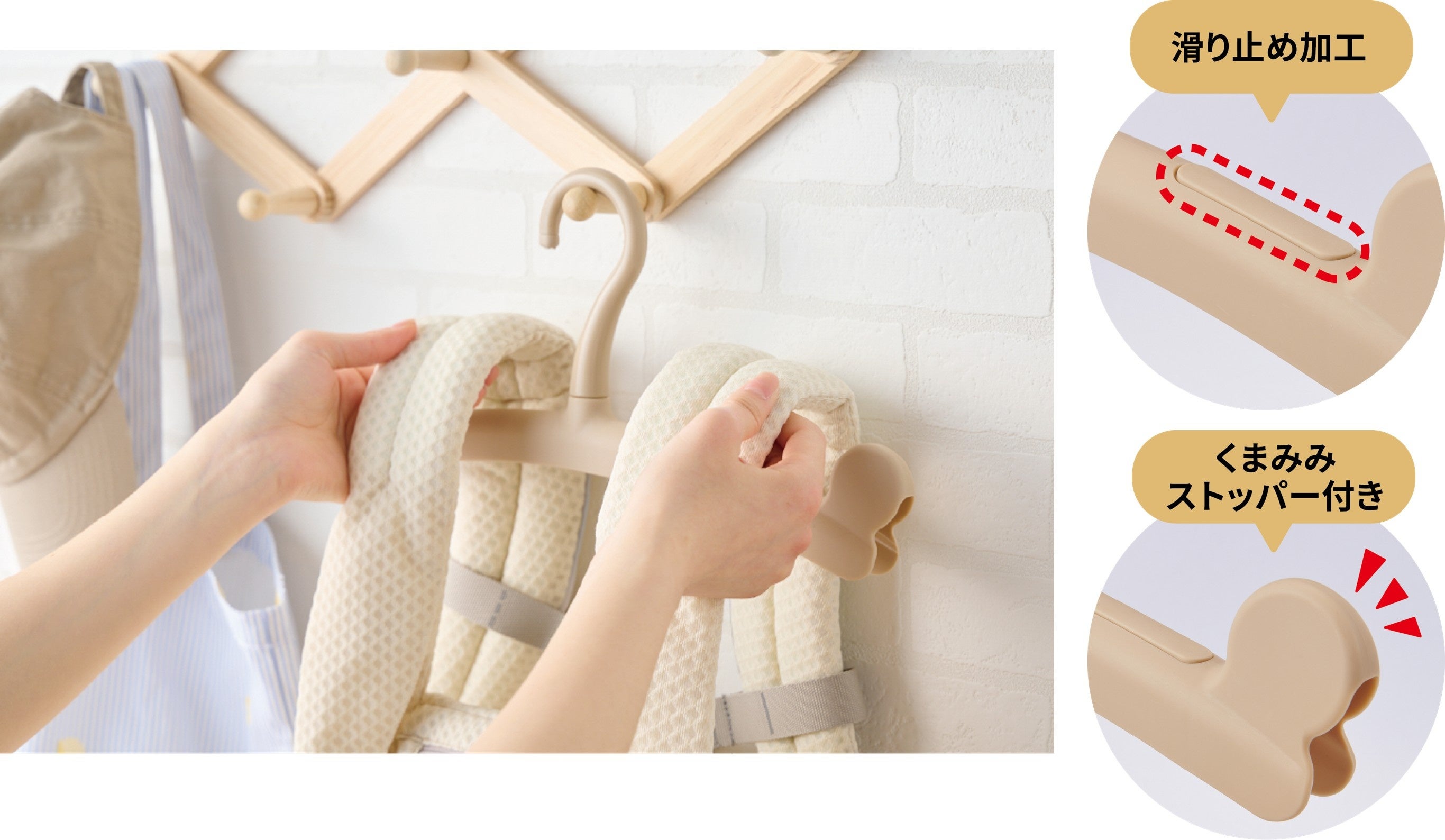 本商品は、おでかけに欠かせない抱っこひもを型崩れせずにキレイに収納できる抱っこひも専用のハンガーです。