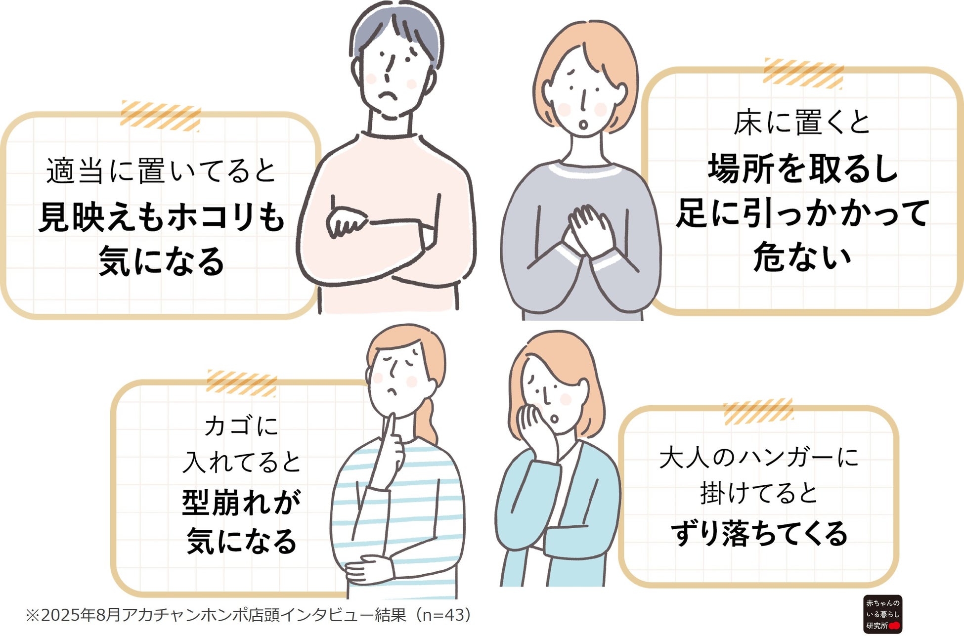 その気づきをきっかけに、社内の調査・研究機関である「赤ちゃんのいる暮らし研究所」と連携し、子育て中のママ・パパへのインタビュー調査(※)を実施。すると、抱っこひもの収納に悩んでいるという声が多数寄せられました。(※)2025年8月アカチャンホンポ店頭インタビュー結果(n=43)