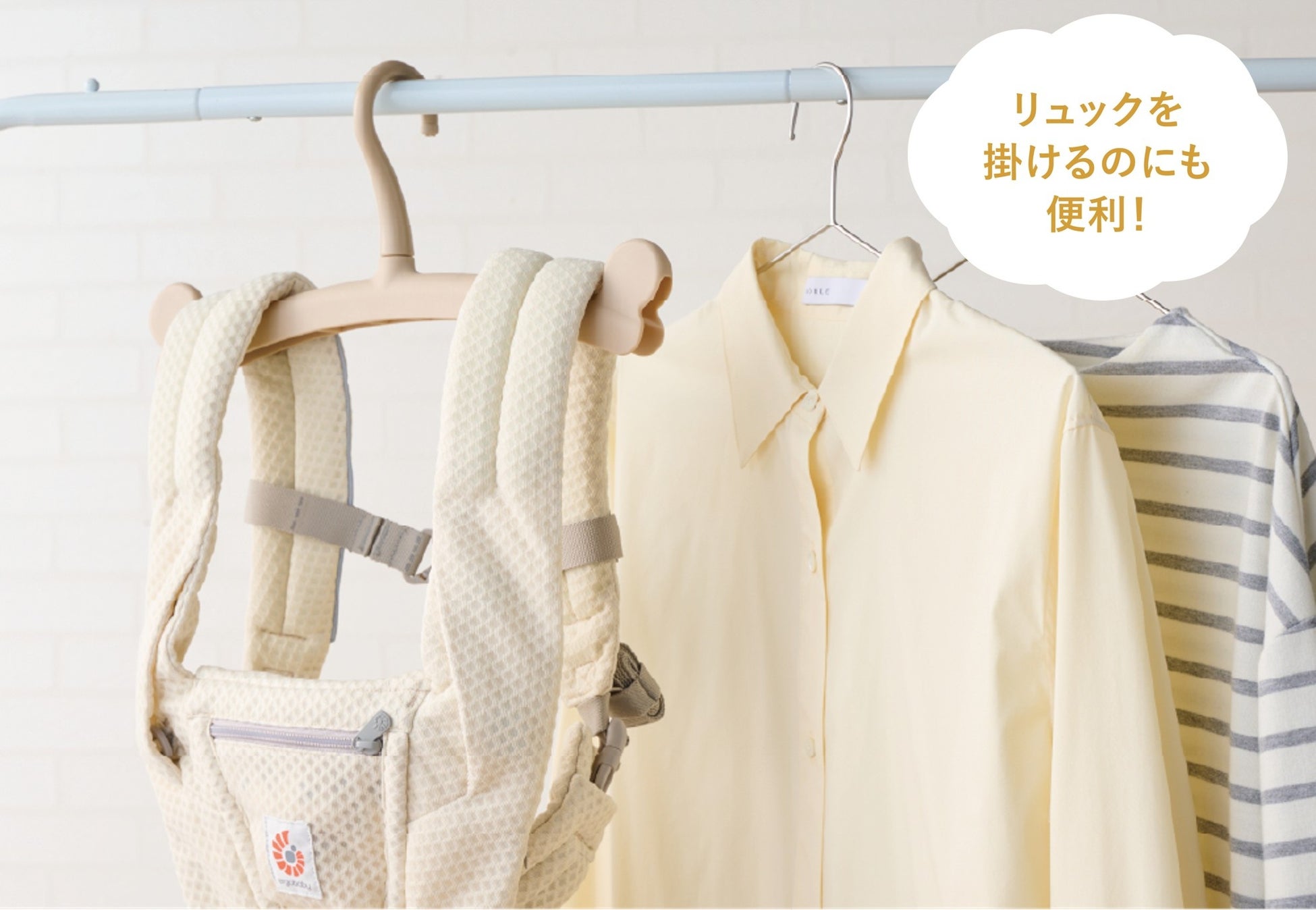 よだれや汗などの汚れが気になるから、頻繁に洗たくしたい抱っこひも。このハンガーなら干している間も型崩れしにくく、乾いたらいつもの置き場所へそのまま移動できます。