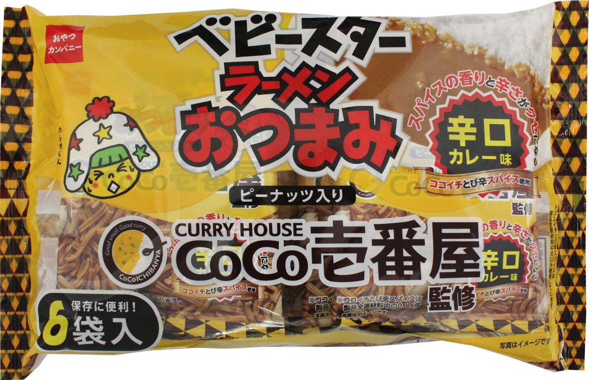 『ベビースターラーメンおつまみ(CoCo壱番屋監修 辛口カレー味)6袋入』が再登場!2009年から続く『ココイチ』とのコラボは「ドデカイラーメン」「ラーメンおつまみ」「ブタメン」「ラーメン丸」など様々なおやつカンパニー商品で展開している大好評企画。今回は家飲みに最適と大好評なベビースターラーメンおつまみとのコラボ商品が再登場します。