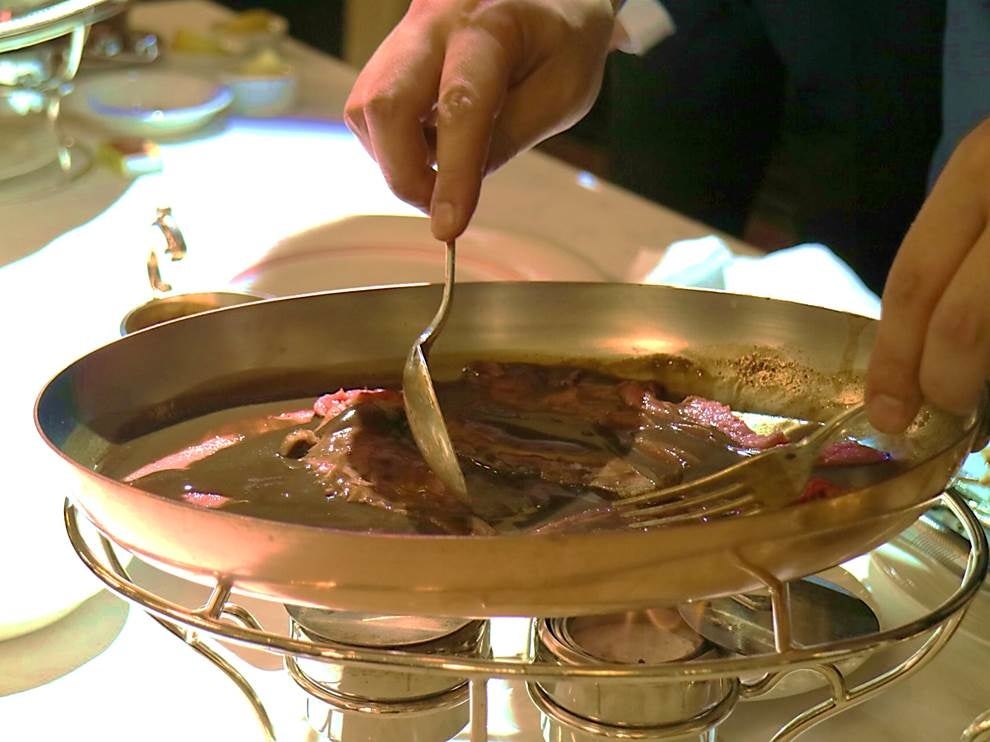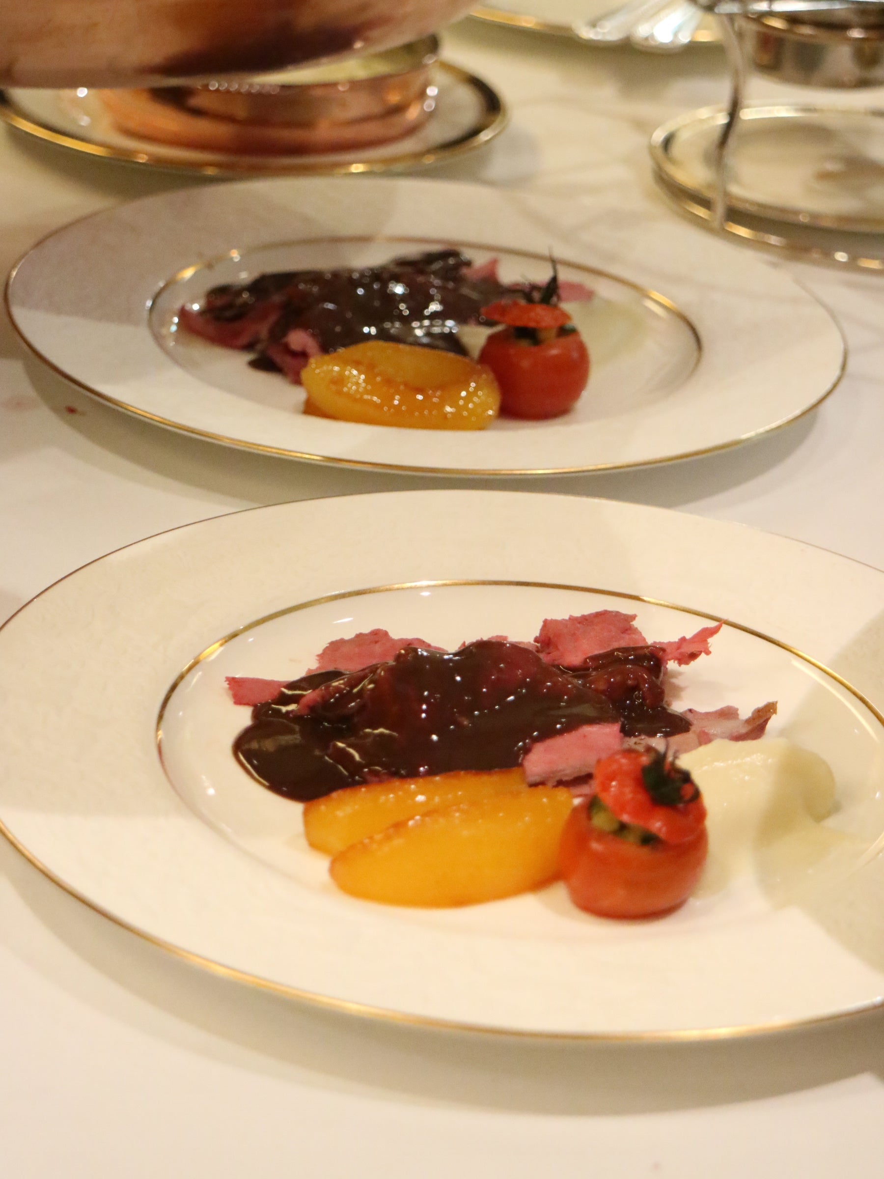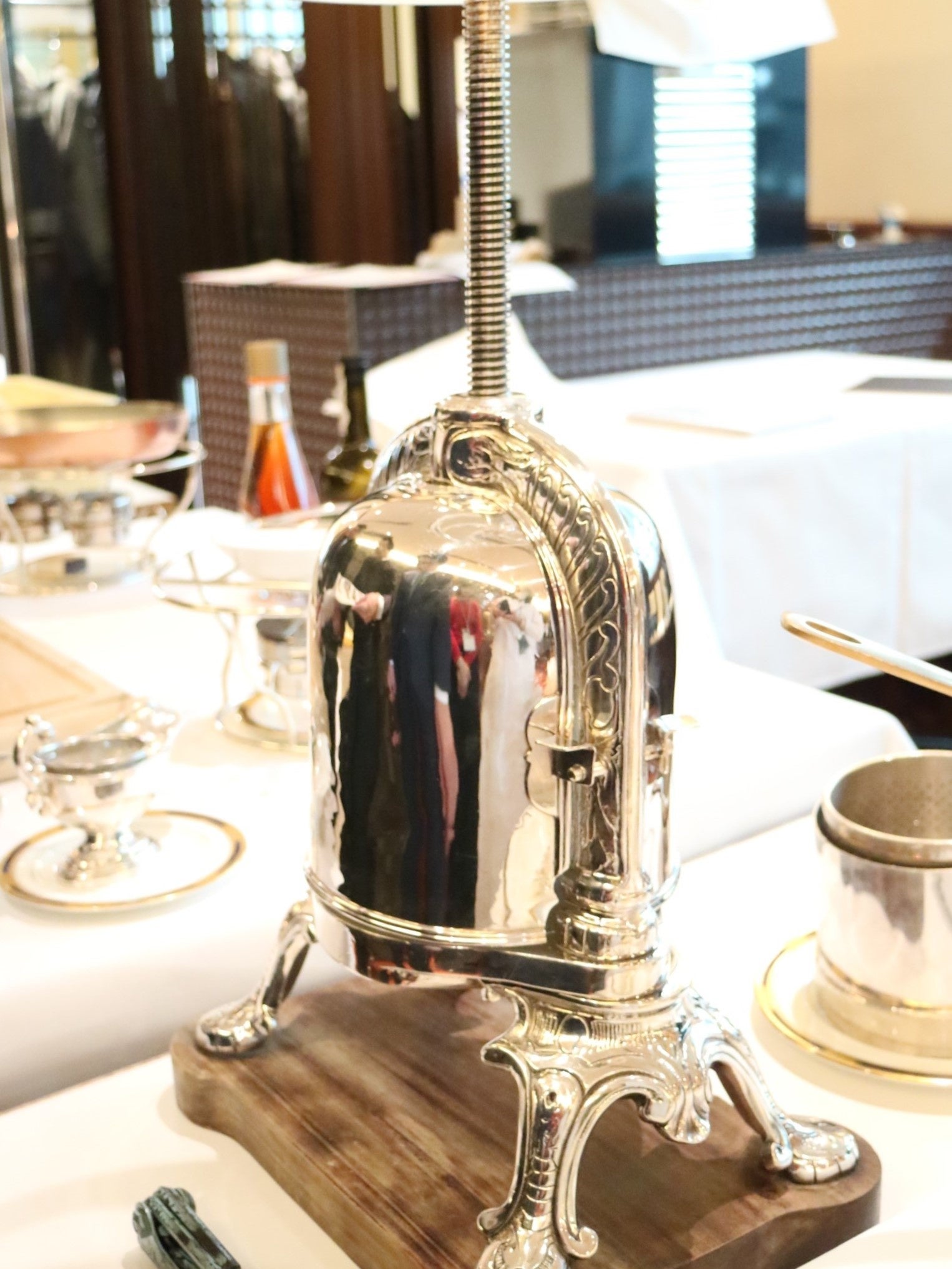 カントン・ルアネーズとも呼ばれるこの一皿、窒息鴨をローストし、プレスカナールという特別なプレスマシーンを用い、胸肉やモモ肉を切り取ったガラから絞り出したエキスをソースの仕上げに使うなど、調理場のシェフとレストランフロアのサービス担当が連携して仕上げます。