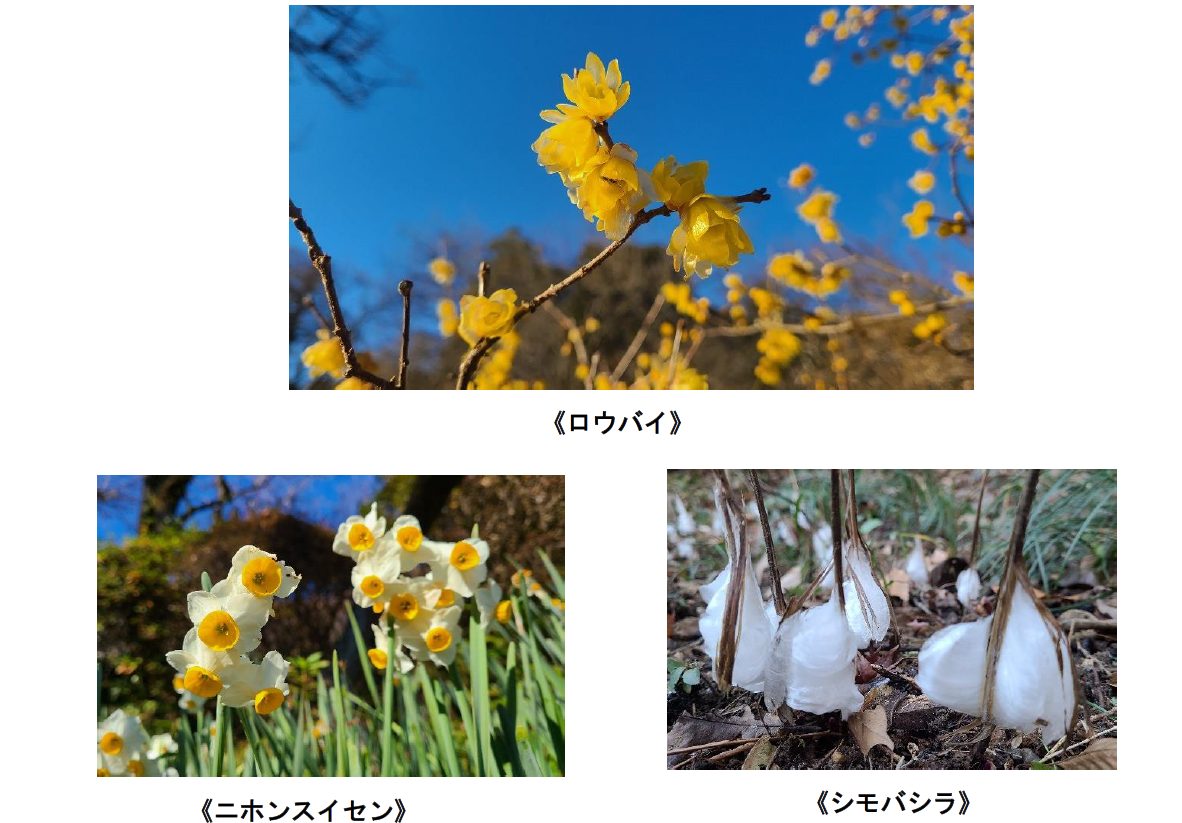 蝋細工のようなつややかな花びら(1.5~2cm)は、冬の青空の下で一層映えています。その他、濃紅色の早咲き梅も少しずつ開花を始め、上品な香りが特徴のニホンスイセンは見ごろを迎えています。なお寒い日が続き、地中からすいあげた水分が凍り、氷の華となったシモバシラも朝方の時間帯を中心に例年よりも多数ご覧いただけます。