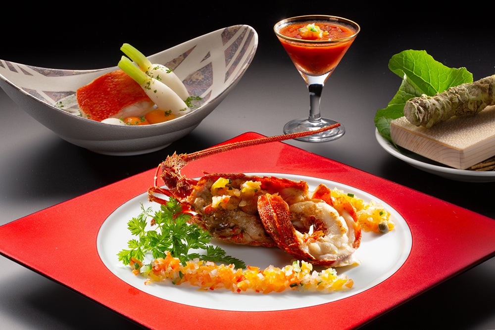 - 進肴:伊勢海老のソテー 夏野菜のディアブルソース
