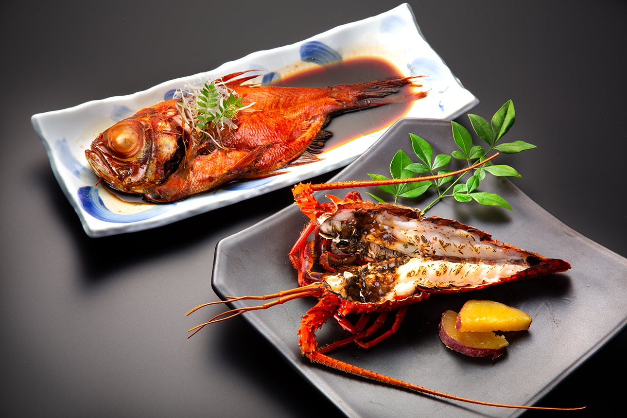 - お造り:相模湾より旬の地魚3種、伊勢海老、蒸し鮑