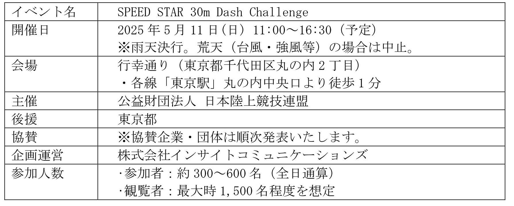その一環として、新しいスタイルのスポーツイベント「SPEED STAR 30m Dash Challenge」を、2025年5月11日(日)に東京駅前・行幸通りで初開催します。