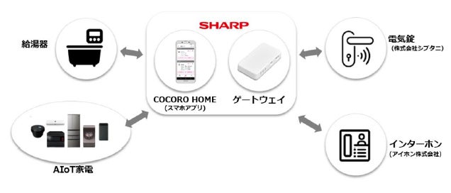 本ソリューションは、シャープ社製の「スマートホームゲートウェイ」を通じてインターホンや電気錠、家電製品など複数メーカーのIoT機器を連携させ、それをシャープ社の提供するスマートホームアプリ「COCORO HOME」を介して操作することで、居住者様に省エネで快適な暮らしを実現するサービス提供を目指すサービスです。