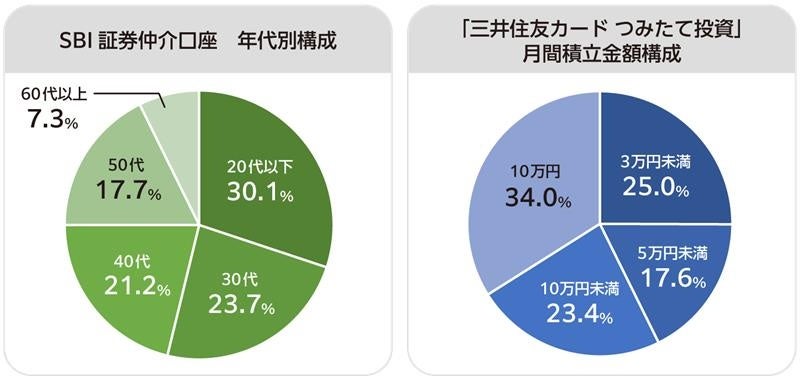 現在、SBI証券仲介口座は30代以下のお客さまが53.8%と半数以上を占めており、若い世代の方が多く資産形成に取り組まれています。また、「三井住友カード つみたて投資」は、毎月上限の10万円を積立されているお客さまが最も多く、NISA口座でもご利用いただけることや証券口座への入金の手続きなく継続投資が行える利便性の高さ、積立金額に対してVポイント還元を受けられる利得性などをご支持いただき、資産運用に積極的にご活用いただいております。