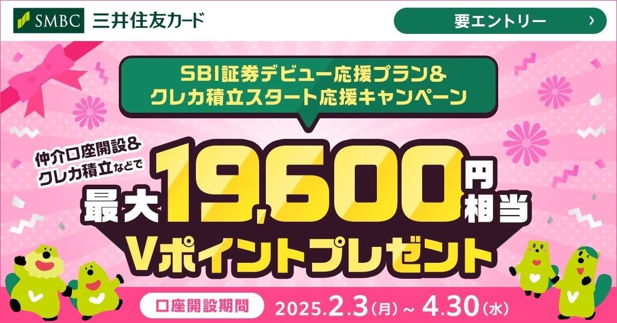 三井住友カード経由でSBI証券口座を新規開設の上、エントリーおよび三井住友カードVポイント認証(Vpass/SMBC ID登録)をしていただくと、100円相当のVポイントをプレゼント