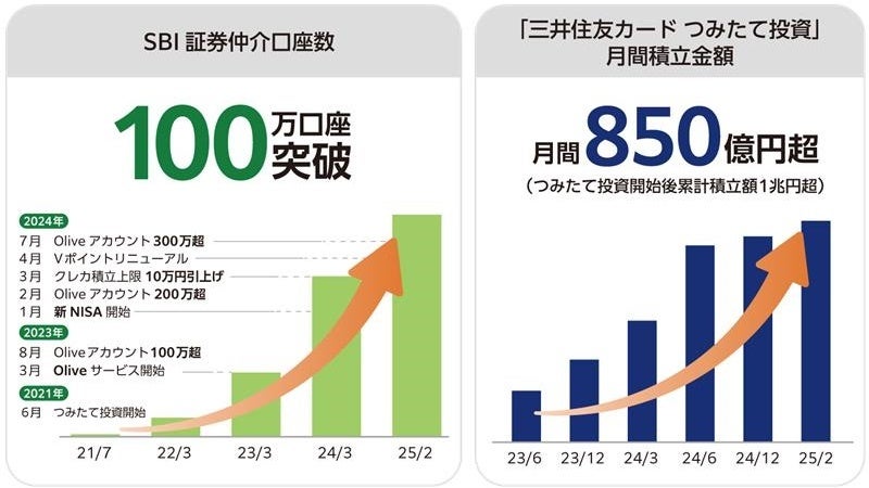 三井住友カード株式会社(本社:東京都江東区、代表取締役社長:大西 幸彦、以下:「三井住友カード」)は、三井住友カードと株式会社三井住友銀行のSBI証券金融商品仲介口座(以下:「SBI証券仲介口座」)が合計で100万口座、「三井住友カード つみたて投資」の月間積立金額が850億円を突破したことをお知らせいたします。