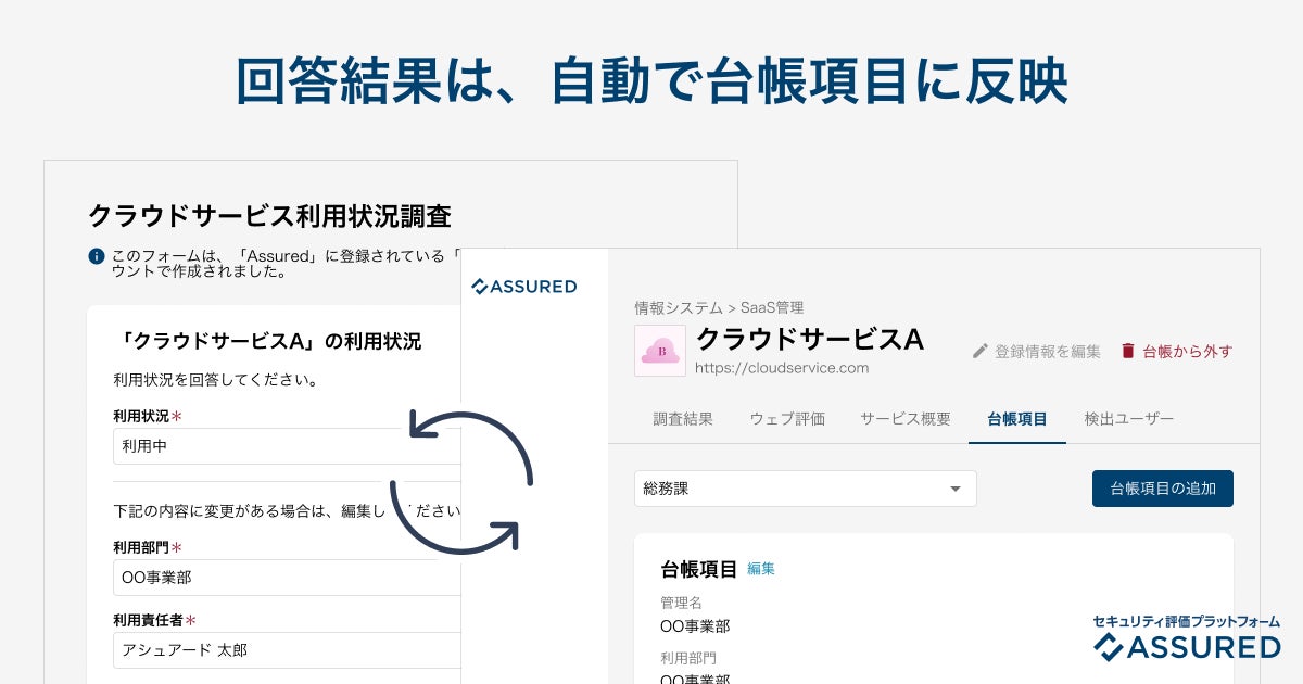 IT・情報セキュリティ部門等の管理者から、クラウドサービス利用部門の責任者に対して、利用状況を確認するアンケートを一括送信し、回答内容はAssured上の台帳に自動で反映されます。これにより、クラウドサービスの利用におけるリスク管理を手間なく網羅的に実現します。