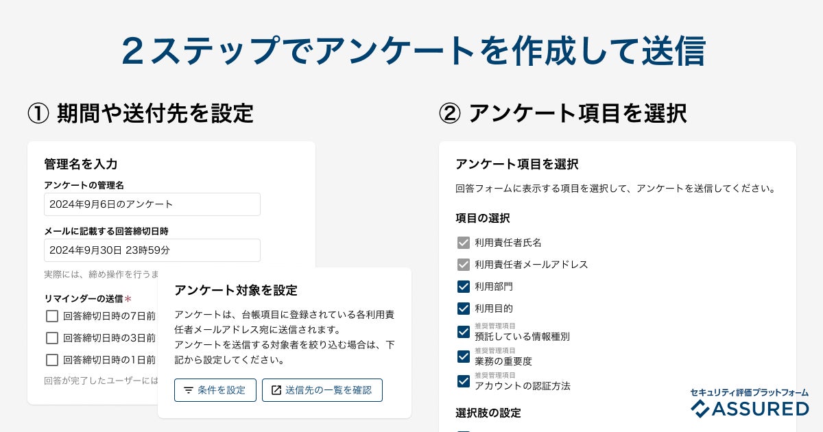 企業ごとにカスタマイズ可能(※2)である管理項目を元に、Assuredのシステム上でアンケートを作成できます。アンケートの締切日、リマインダーの設定要否、アンケート対象のサービスを選択可能です。設定が完了次第、対象者にアンケートが一括送信されます。