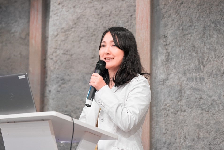 当社のヒト科学研究所 所長 中島綾香(以下「中島」)が、ユーグレナの化粧品原料に関する研究成果を紹介し、さらに、同日に情報解禁となった医薬部外品※1・化粧品原料として新しく規格化した「パラミロン原末※2」についても解説しました。