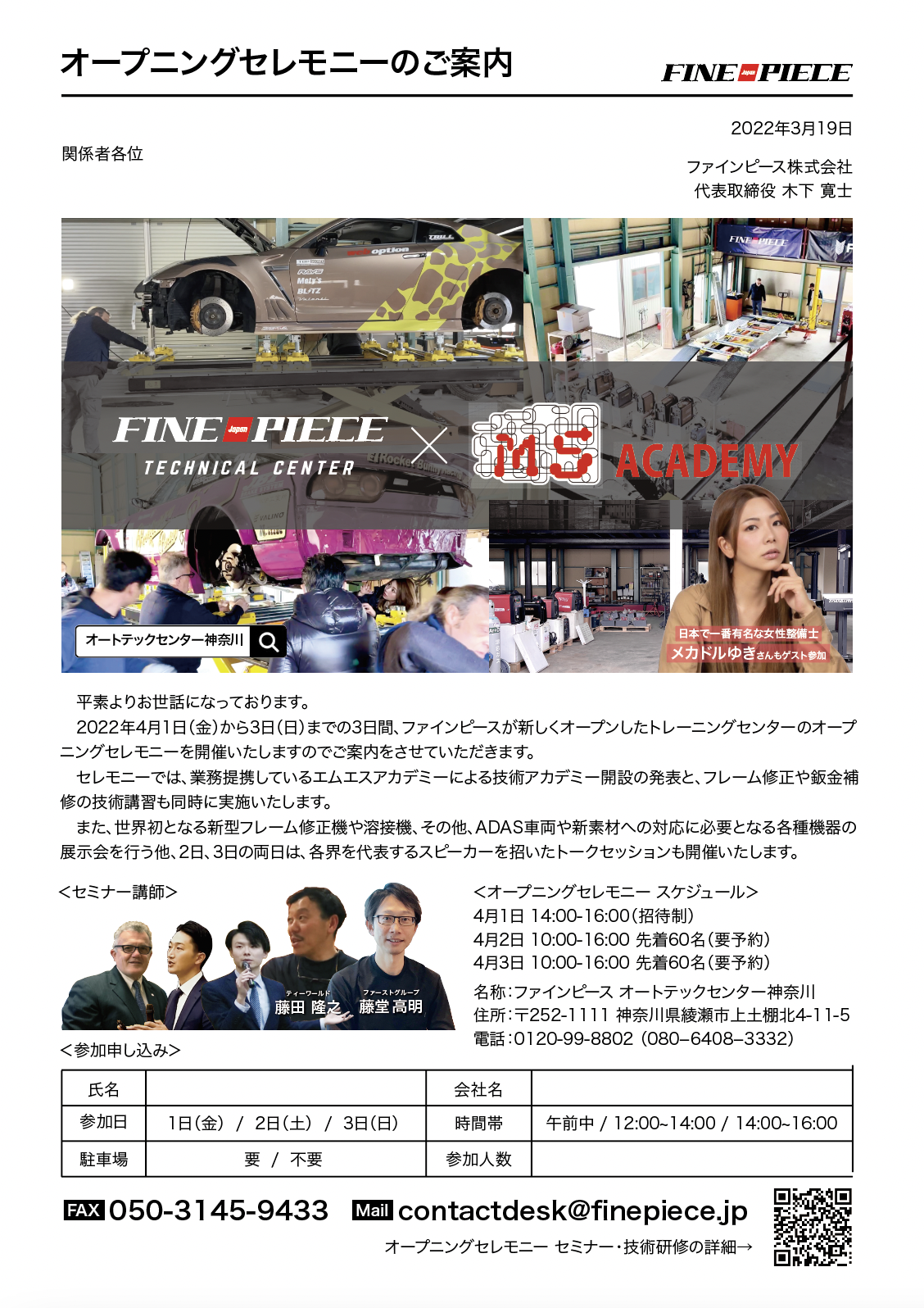 4/1から3日間、ファインピースがオートテックセンター神奈川のオープニングセレモニーを開催。
