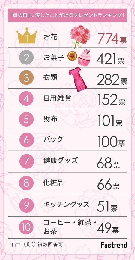 ということで「母の日」のプレゼントで贈ったことがあるプレゼントTOP10は以上のようになりました!