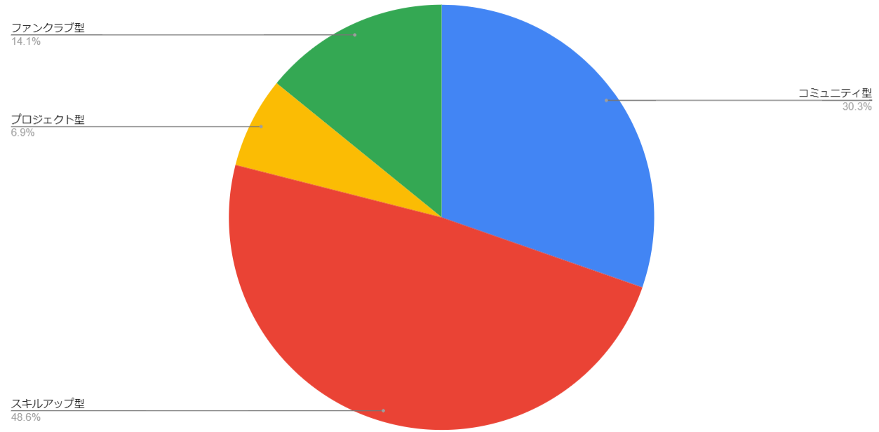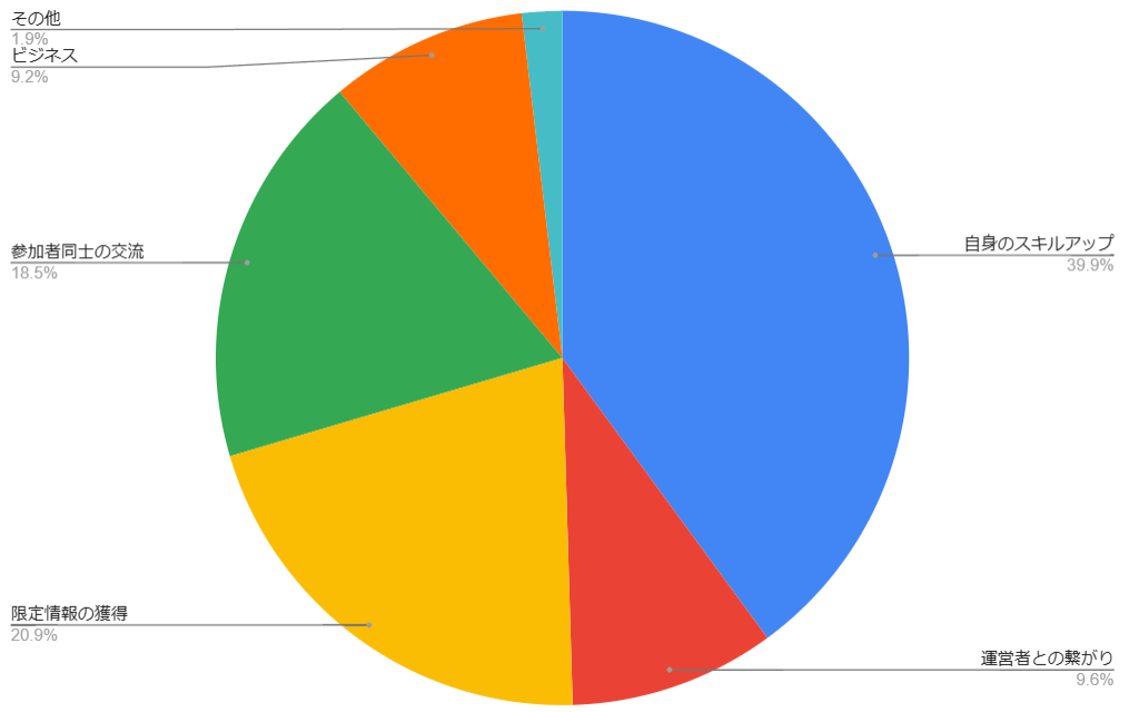 スキルアップ型が突出して高いことは、SNSには無いものをオンラインサロンに求める一般社会からのイメージを強く裏付けるものだと言える。