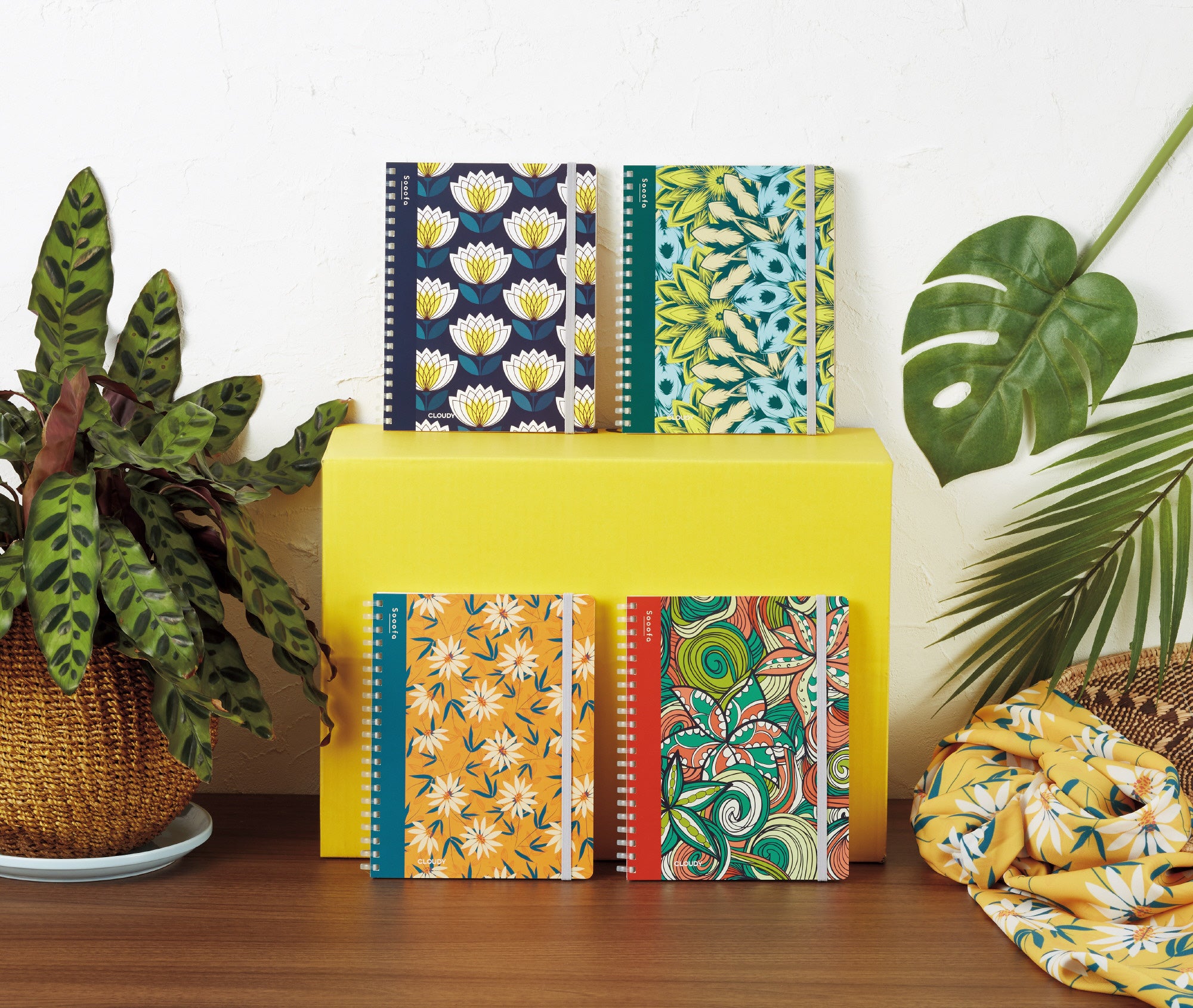 コラボレーションアイテムでは、CLOUDYのテキスタイルデザイナーが描く、アフリカの伝統柄をアップデートさせた大胆で鮮やかなボタニカル(植物)をテーマに表紙をあしらい、それぞれタッチの違う4種類をラインアップしています。
