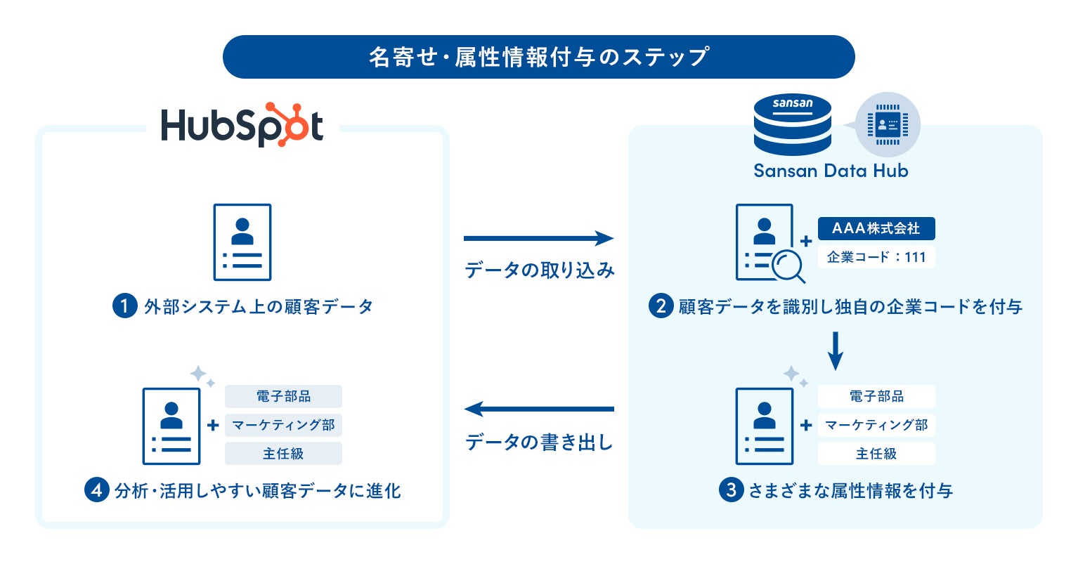 また、HubSpotに登録されている情報をSansan Data Hubに取り込むことで、登録済みデータを整理できます。HubSpotから取り込んだ情報に、Sansan独自の企業識別コード(SOC : Sansan Organization Code)を付与することで、表記ゆれなどが原因で同一企業と識別されていない情報や、重複している情報を正確に識別・ひも付けできるようになります。さらに、Sansanが「業界名」「取り扱いサービス・製品カテゴリ」「役職の重要度」など100種類以上の属性情報を自動で付与するため、HubSpotに分析・活用しやすい顧客データ基盤を構築できます。