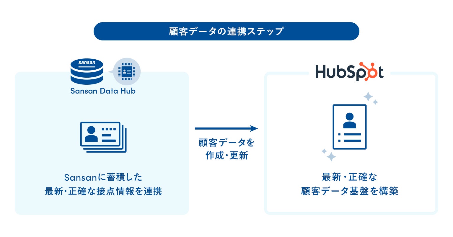 今回の連携により、Sansanに蓄積された名刺や接点情報など正確な顧客データを、HubSpot上に自動で登録できるようになります。「企業名」「氏名」「役職」「連絡先」といった項目が、Sansanのデータを基に自動で作成・更新されます。