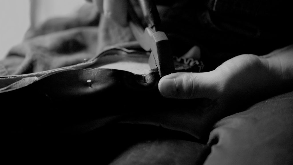 アッパーは一寸17〜19針という既成靴では規格外のピッチで縫い上げます。ミシンが進みすぎないよう手元に引きながら目視と手先の感覚で行うため、繊細な感覚と集中力を要する工程です。美しさと強度を両立させるためには熟練の技術が必要となり、素材への理解と共に美意識の高さも大事なファクターとなっています。