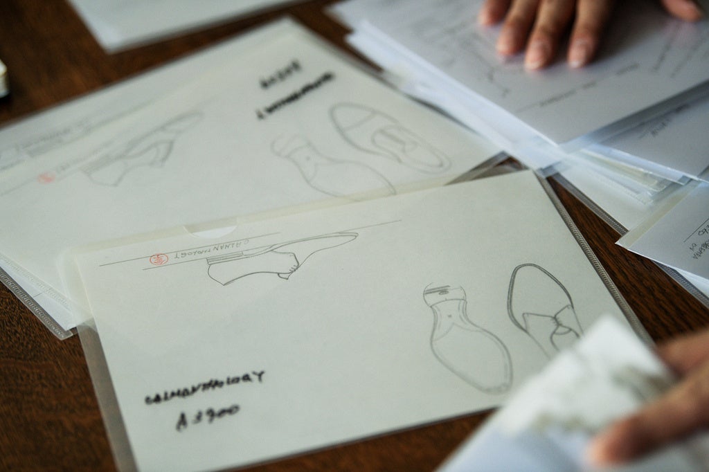 大事なのはディテールや作りだけに偏重するのではなく、ファッションとして捉えた時にどう存在すべきなのか。エレガンスなのか、無骨なのか、第三者が見た時にどのように捉えられるのかの視点は欠かせません。デザイン画を書き始める時、私は底面のラインから必ず筆を走らせます。着用者の視点では俯瞰でアッパーを見る形になりますが、他者から見えるサイド面が流れるようなラインを描けているかを意識しているからです。自己満足だけに帰結せず、スタイリッシュに見られることを美意識として捉えています。