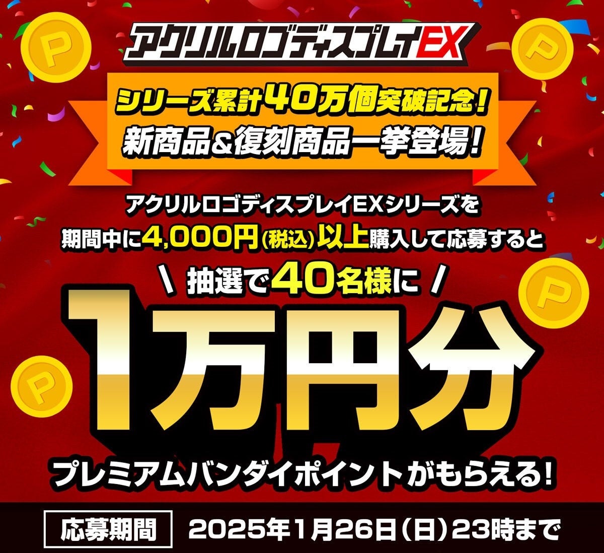 2025年1月26日(日)23:59までにプレミアムバンダイにて対象商品『アクリルロゴディスプレイEX』シリーズを4,000円(税込)以上注文し、応募フォームからお申し込みいただいたお客様に抽選で40名様に「プレミアムポイント(プレミアムバンダイのポイント)1万円分」をプレゼントいたします。