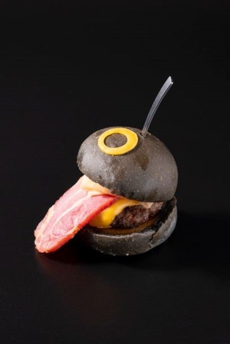 竹炭を練り込んだバンズに信州和牛のパティ。柿や柿酢でマリネした大根とチェダーチーズ、舌に見立てたベーコンをサンド。