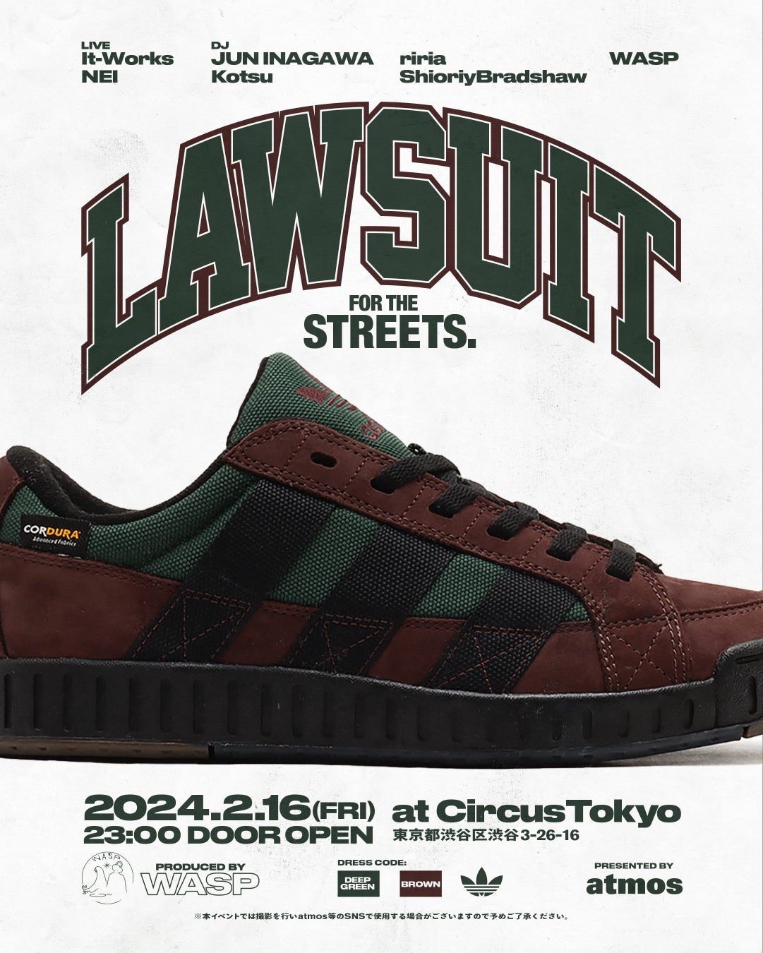 「訴え」を意味するLAWSUITの語源にフックさせ、昨今のストリートシーンに対する思いをLAWSUITと共に発信するムーブメントを一つのイベントとして表現。オリジナルモデルのヴィジュアルモデルを務めたGen YamadaとSOTAによるDJデュオ “WASP”をオーガナイザーに迎えつつ、同じくモデルを務めた“NEI”のLIVEなど東京の音楽シーンを担うアーティストたちによるパフォーマンスを展開。OG世代から始まり紡いだ、LAWSUITとストリートカルチャーをこれからの時代へと繋げるイベントとなっております。