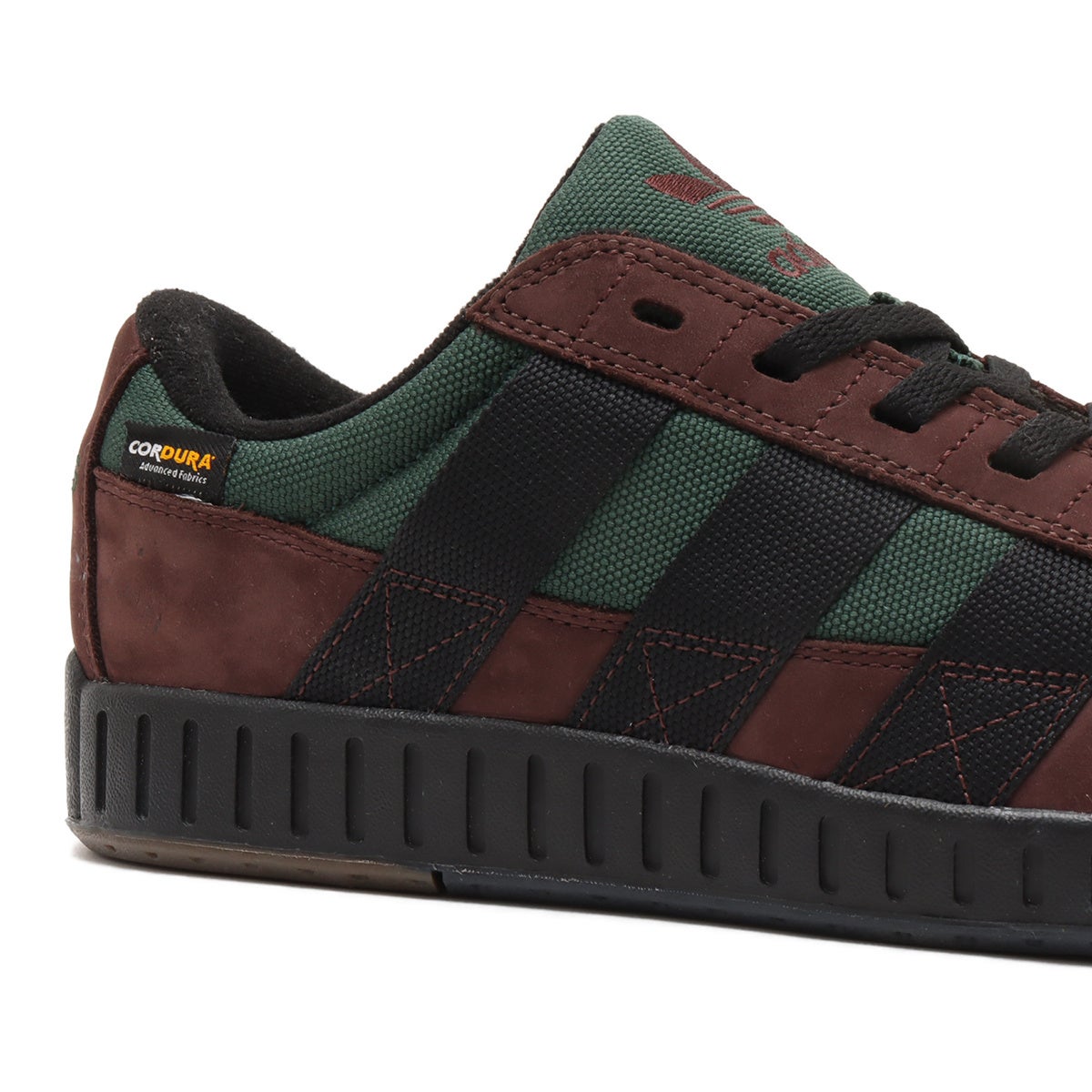 アッパーにはブラウンのヌバック素材を用い、LAWSUITの特徴的なミッドソールにはオリジナル同様のブラックを落とし込んでいます。サイドパネル、シュータン部分には高強度素材として知られる「CORDURA® fabric」を採用。耐久、軽量など富んだ機能はもちろん、ヒール部のピスタグもデザインアクセントに。