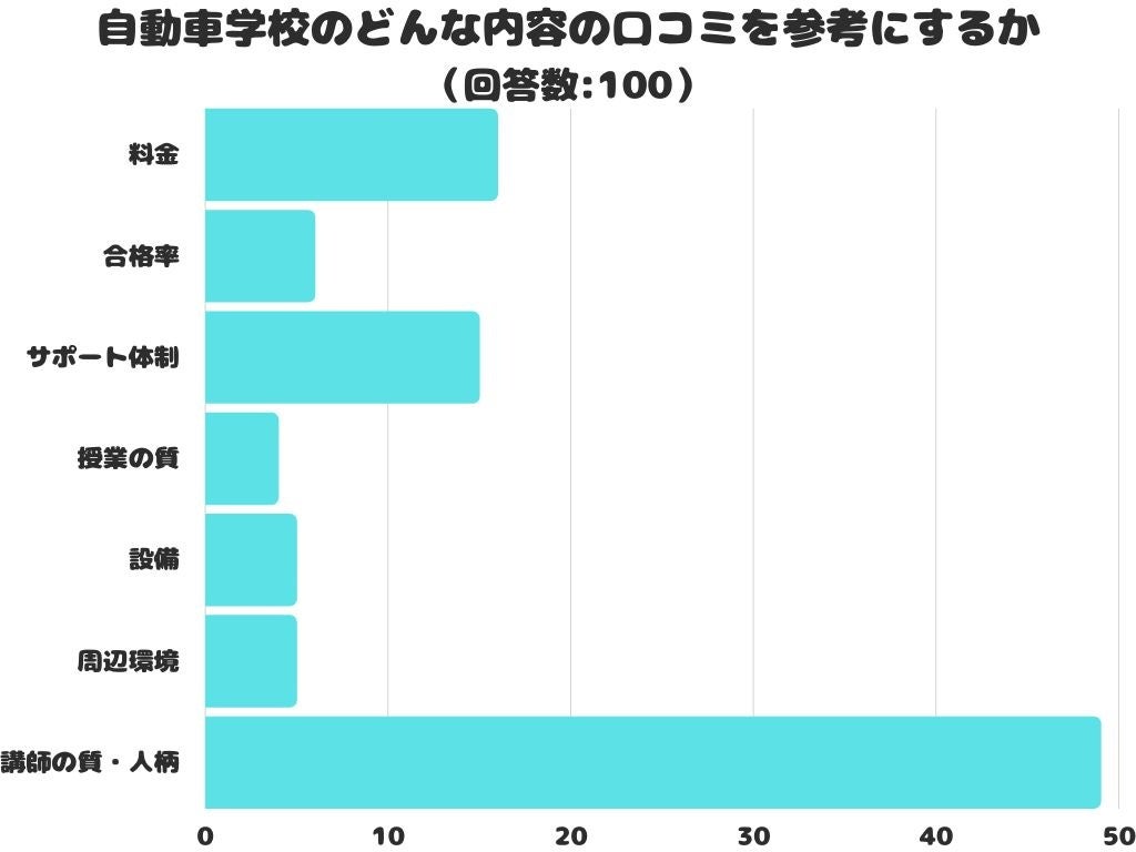 自動車学校のどんな内容の口コミを参考にするかをアンケートにて調査したところ、1位は「講師の質・人柄」でした。