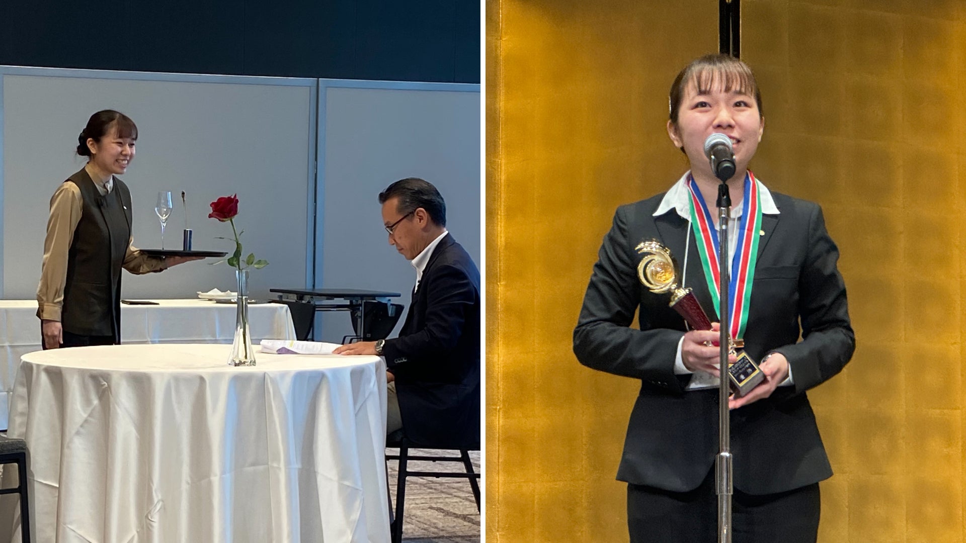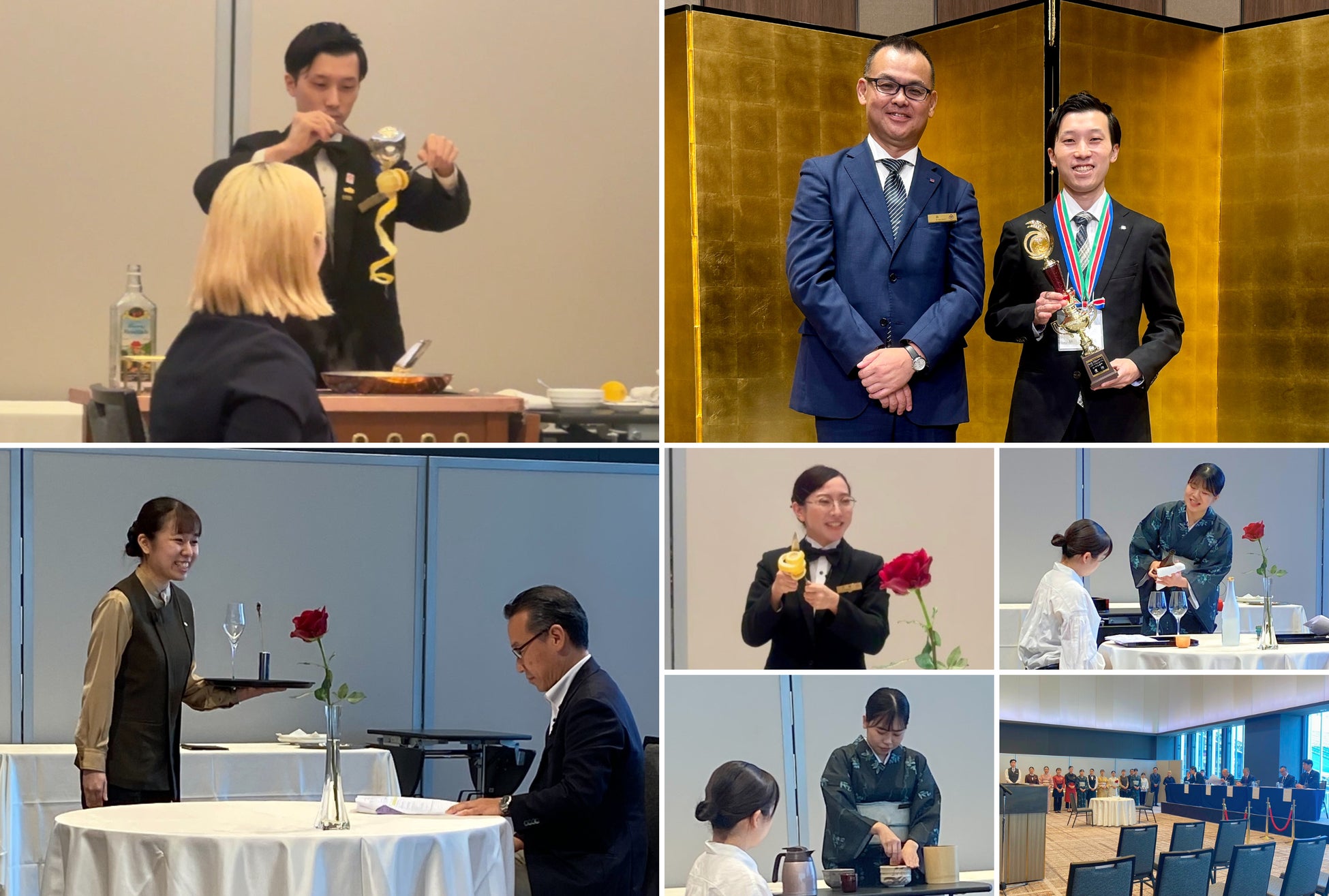 コンテストは年齢や勤続年数に応じ「ジュニア部門」と「シニア部門」の2部門に分けて開催し、「ジュニア部門」では、各選手自らが作成したシナリオに沿った接客をロールプレイング形式で実施し、接客技術やホスピタリティマインドを重視した審査を行いました。「シニア部門」では、ワイン・メイン料理・創作デザートの提供シーンを想定した接客と実技を実施。基本的な技術に加え、英語での接客や料理に合うワインの提案など、当グループホテルの「食」をあらゆる方によりお楽しみいただくための提案力やおもてなし力を審査しました。