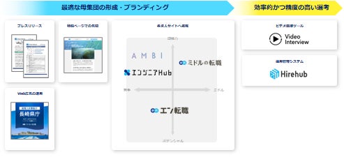 プレスリリースや特設ページ、Web広告での告知に加え、各求人サイトでの集客支援を行ないます。『エン転職』『AMBI』『エンジニアHub』『ミドルの転職』とターゲットの異なる4つの求人サイトを活用することで、ターゲットへ網羅的に求人を届けます。ビデオ面接ツール『Video Interview』、採用管理システム『Hirehub』の提供により、選考フローを支援。求職者との適切なマッチングを実施します。