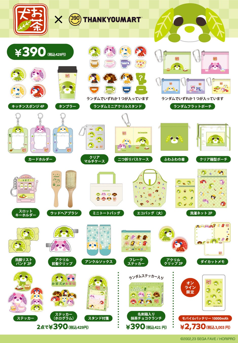 「Be Smile, Be Kawaii」をテーマに、全品390円(税込429円)でバラエティ豊かなアパレル雑貨を揃える「サンキューマート」は、株式会社セガ フェイブのキャラクター「お茶犬」とのコラボレーション雑貨を、全国のサンキューマート店舗で2月下旬より入荷次第販売開始いたします。