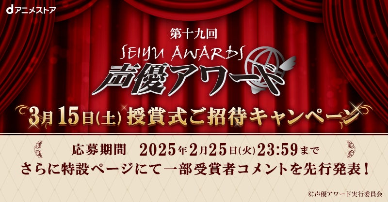 6,000作品以上のアニメが見放題(※)の「dアニメストア」(https://animestore.docomo.ne.jp/ )では、2025年3月15日(土)に行われる「第十九回声優アワード 授賞式」へのご招待キャンペーンを実施いたします。※2024年12月3日時点、一部個別課金あり