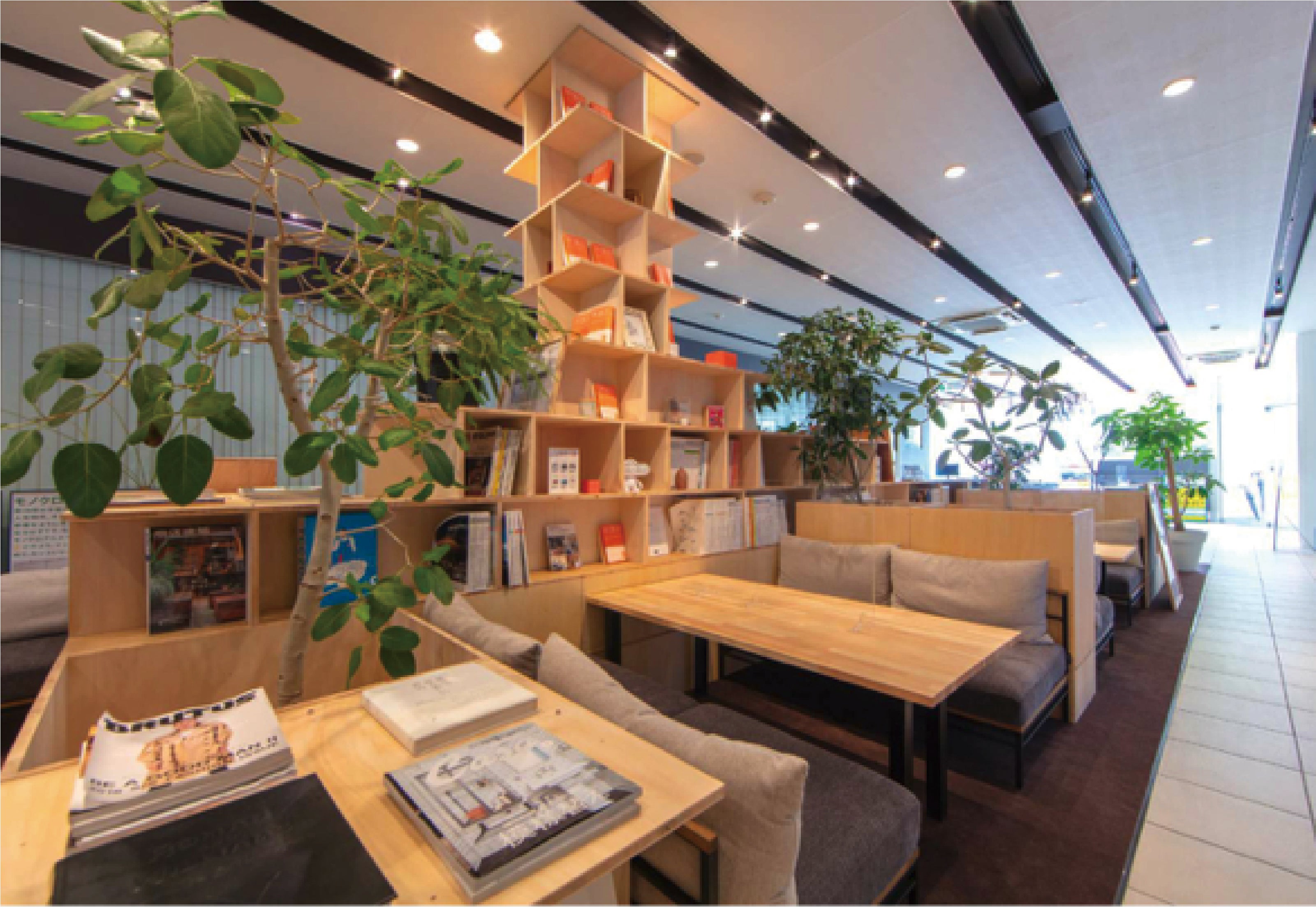本社機能も兼ね揃えたけやき通り店では、賃貸・売買のお客様に向けて、本屋やカフェを想起させる、寛ぎの空間を提供しています。店内には、クラスコの社員が造作した棚が設置されており、リノベーションやデザインなどライフスタイルに関わる書籍などを読んでいただける空間になっております。