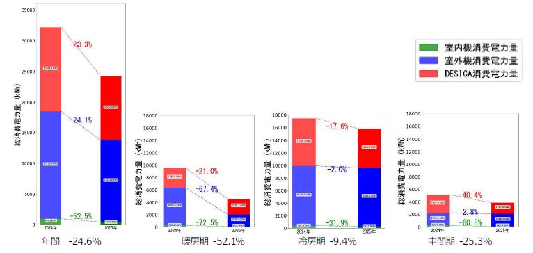 夜間の空調つけっぱなし運転や過剰な予冷・予熱を防止する「省エネ予冷・予熱制御」、ならびにDESICAの無駄な運転を抑制する「CO₂換気量制御」などを導入した結果、年間を通じて空調総消費電力を24.6%削減しました。特に、室内のCO₂濃度および湿度に応じて風量を自動調整する「CO₂換気量制御」は、在室状況や室内環境に応じた最適な換気量制御を可能とし、不要な換気運転を抑制することで、消費電力削減に大きく寄与しました。さらに、冬期には室内の外壁や窓に近いエリアと中央部との温度差により、冷房運転と暖房運転が同時に発生する冷暖混合ロス※7が生じ、無駄な消費電力が発生していました。今回、「低負荷時最適運転制御」を導入し、室内温度を均一化することで冷暖混合ロスを解消した結果、暖房期における消費電力量を52.1%削減することができました。同時に、室内のセンサ情報からは、快適な室内温度が維持されていることも確認しています。