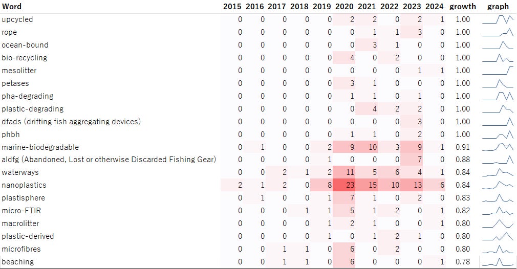 図1は2015年から2024年まで10年間の、海洋ごみに関連するグラントの研究概要に含まれている特徴的なキーワードの年次推移です。成長率(growth)は文献内の全期間における出現回数に対する、後半5年間での出現回数の割合をあらわします。1に近いほど直近に多く出現しているとみなせます。