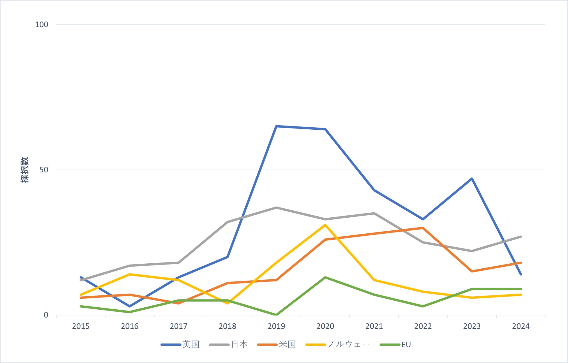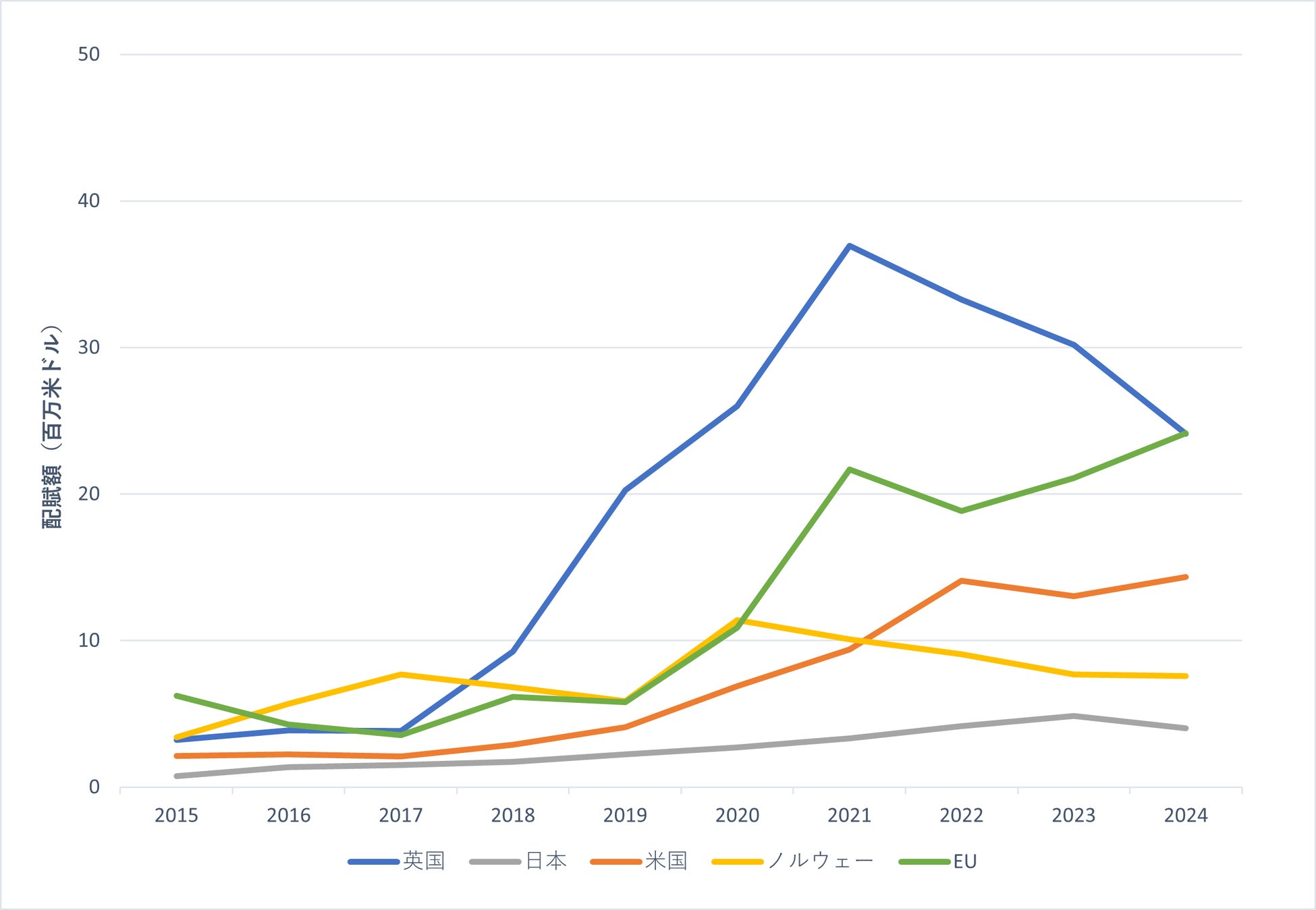 件数と配賦額ともに英国が1位となっており、2018年から配賦額が急増しています。EUがそれを追う形で2020年から配賦額が増加し、直近では英国にせまっています。