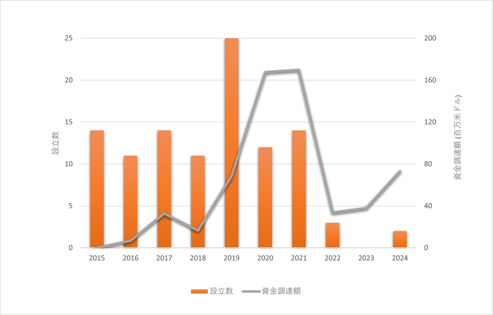 2015年から2024年までにおける、海洋ごみに関するスタートアップ企業の設立された社数と資金調達額の推移が図4です。