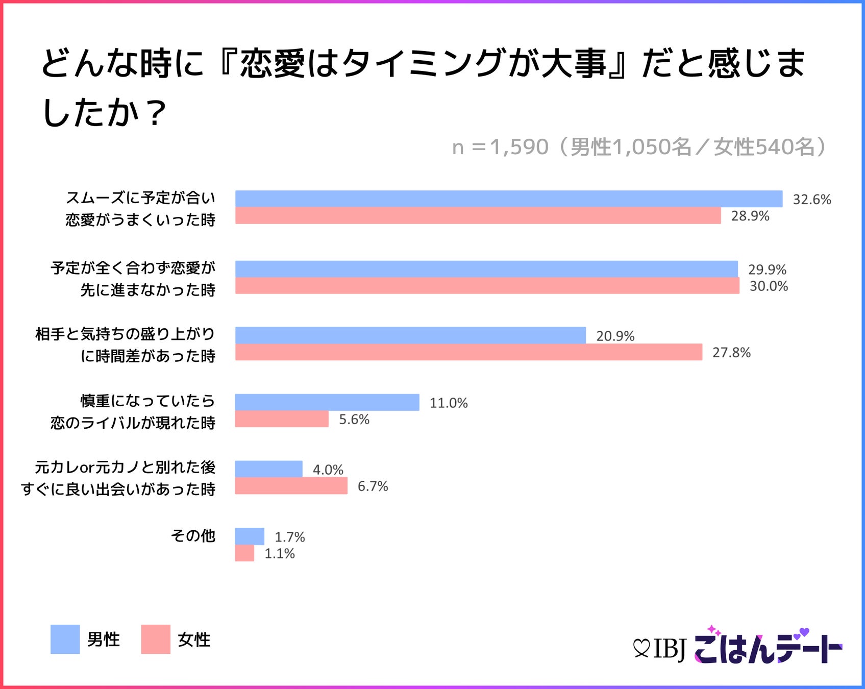 さらに、タイミングが大事だと感じた時を調査したところ『スムーズに予定が合い、恋愛がうまくいった時(男性32.6%、女性28.9%)』『予定が合わず、恋愛がうまくいかなかった時(男性29.9%、女性30.0%)』『相手との気持ちの盛り上がりに時間差があった時(男性20.9%、女性27.8%)』という結果に。せっかくの良い出会いがあっても、予定が合わずにすれ違いが続いてしまうと、相手への好意にも影響が出てくるのかもしれません。