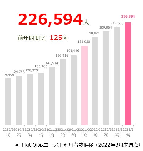 2013年7月より販売を開始し、2021年11月には累計出荷食数1億食を突破いたしました。利用者数は順調に推移し ており、Oisix定期会員 346,083人のうち、65%に あたる226,594人が定期的 にKit Oisixが届く「Kit Oisixコース」に登録しており、前年同期比で25%増加 しています(2022年3月末時点)。