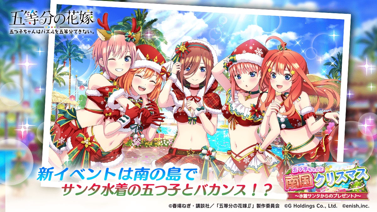 株式会社enish(本社:東京都港区、代表取締役社長:安徳 孝平、以下enish)は、2022年12月2日(金)より、アニメ「五等分の花嫁」初となるゲームアプリ『五等分の花嫁 五つ子ちゃんはパズルを五等分できない。』にて、週刊少年マガジン編集部完全監修のゲームオリジナルストーリーをフルボイスでお楽しみいただける新イベント「五つ子ちゃんと南国クリスマス~水着サンタからのプレゼント♪~」を開催いたします。