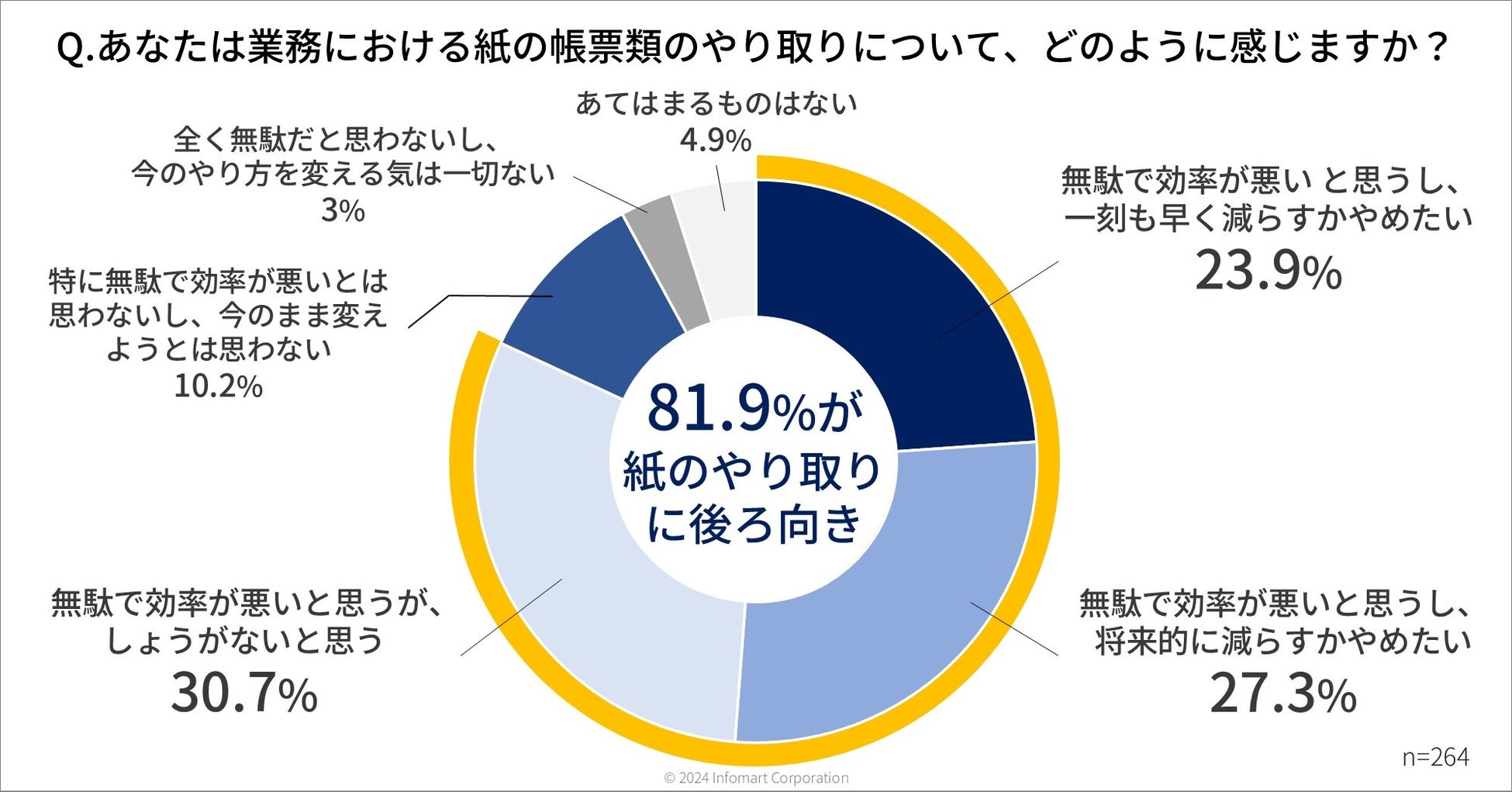 業務における紙の帳票のやり取りについて聞いてみると(n=264)、81.9%が「やめたいと思う」や「しょうがいないと思う」等、後ろ向きであることが分かりました。なお、23.9%が「無駄で効率が悪いと思うし、一刻も早く減らすかやめたい」、27.3%が「無駄で効率が悪いと思うし、将来的に減らすかやめたい」と回答しており、半数以上が明確に「紙の帳票のやり取りをやめたい」と回答しています。