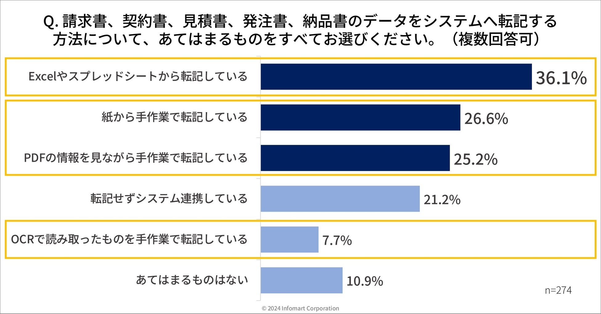 請求書等の帳票類の情報をシステムへ転記する方法について聞いてみると(n=274)、「Excelやスプレッドシートから転記している」が36.1%で最多、「紙から手作業で転記している」が26.6%、「PDFの情報を見ながら手作業で転記している」が25.2%、「OCRで読み取ったものを手作業で転記している」が7.7%となりました。