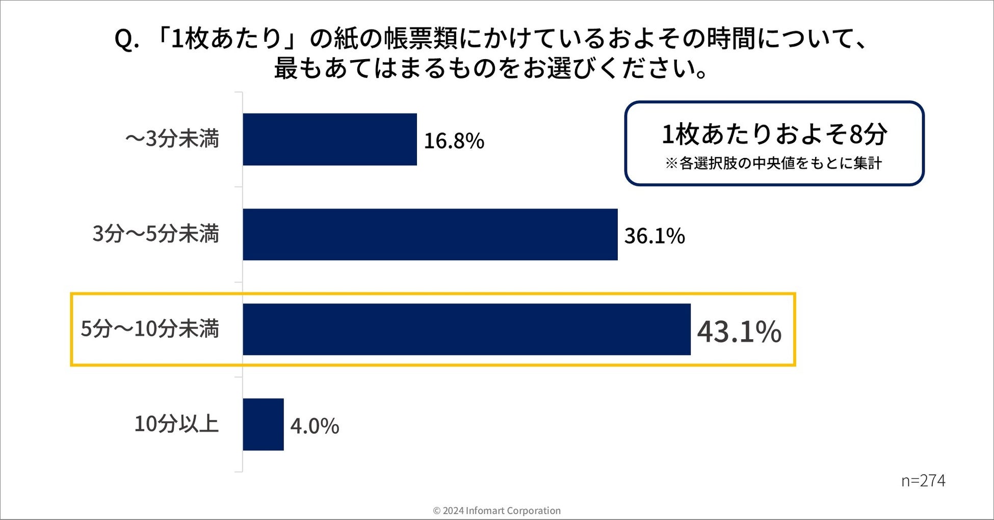 請求書等の帳票類の処理にかける時間について聞いてみると(n=274)、「5分~10分未満」が43.1%で最多となりました。前問同様、回答の中央値を基に平均を算出したところ、1枚あたりおよそ8分となりました。前問の平均枚数と処理時間を基に、年間の人件費を試算すると、【紙の帳票の割合452枚×平均処理時間約8分×平均時給1,285円(※1)×12ヵ月=約93万円】のコストがかかっていることが分かりました。