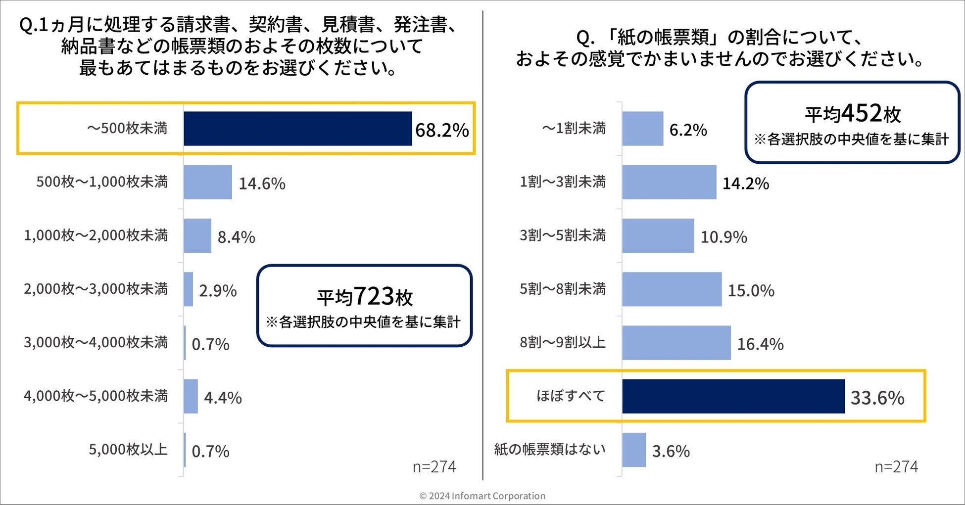 ・1ヵ月に処理する帳票類は平均「723枚」。そのうち、紙の書類は平均「452枚」