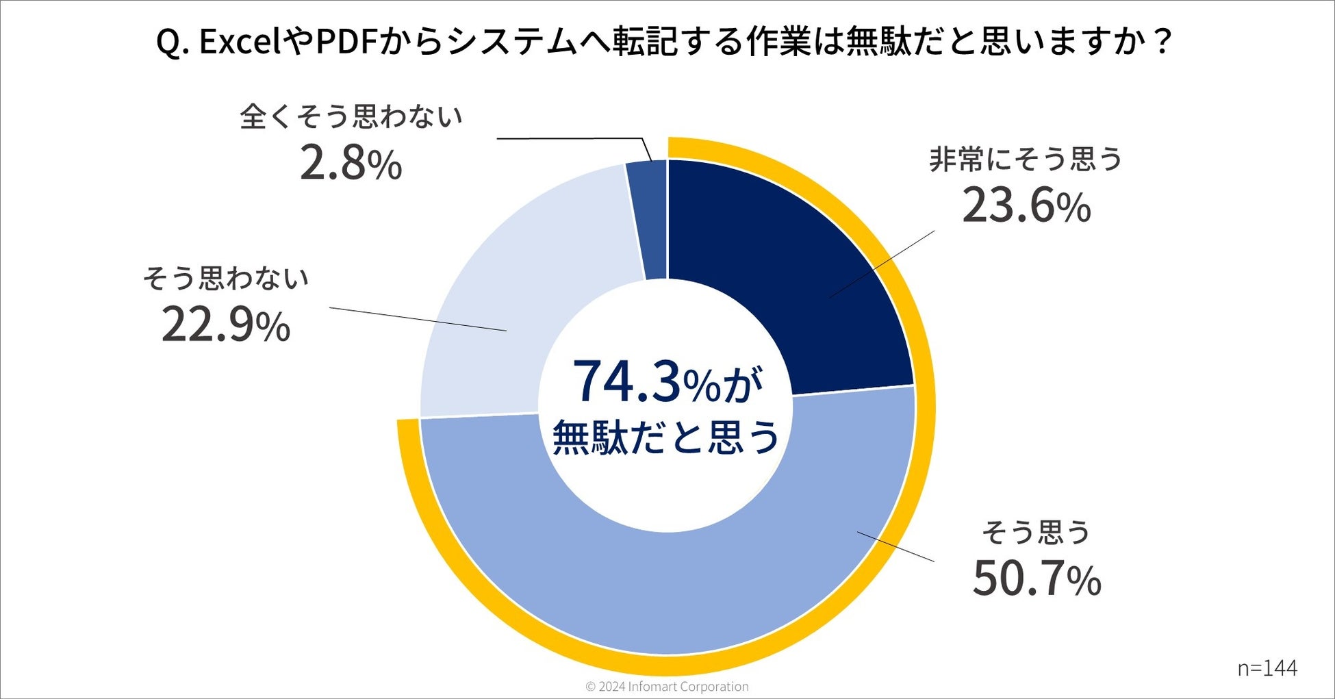 前問で、「請求書等の帳票類の情報をExcelやスプレッドシート、PDF等からシステムへ転記している」と回答した人に、その転記作業について無駄かどうかを聞いたところ(n=144)、「非常にそう思う」が23.6%、「そう思う」が50.7%となり、74.3%が「無駄」だと感じていることが分かりました。