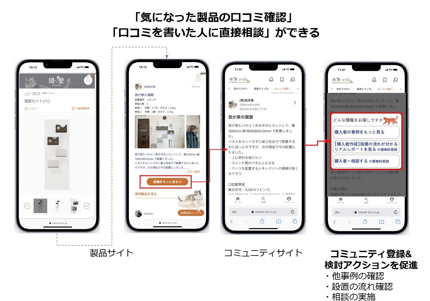 「猫壁ひろば」は、LIXILからの製品に関する情報発信だけでなく、猫壁で愛猫が遊んでいる生の様子や製品のレイアウト、口コミや質問などをWEBサイト上でエンドユーザー同士が自由に情報交換することができるコミュニティです。「猫壁」の購入検討者が実際に製品をご利用いただいているお客さまから直接意見を聞くことができ、購入検討者の購入前の情報収集にも役立っています。