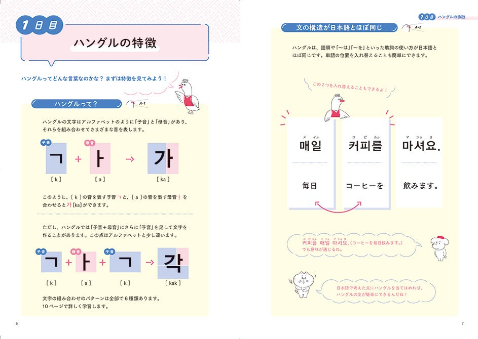 本書は、カラー図解で見てわかりやすく、やさしく説明。書き取りなどはなく、時間があるとき、1日に2つのパートを読むだけ。本の中に登場するキャラクターたちと一緒に考えながら楽しんで、自分のペースで進めれらます。無料のダウンロード音声がついているので、発音もしっかり確認しながら勉強できます。50音表や、旅先でも使えるフレーズ集など、より学習を深める付録も充実しています。