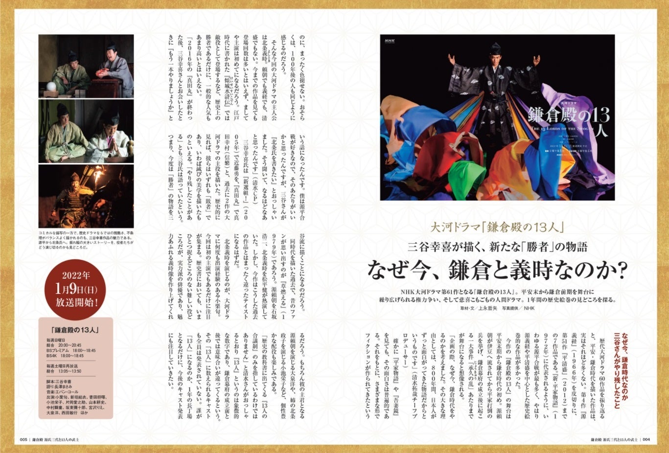 いよいよ1月9日(火)より放送開始のNHK大河ドラマ第61作となる『鎌倉殿の13人』。平安末から鎌倉前期を舞台に繰り広げられる権力争い、そして悲喜こもごもの人間ドラマ。1年間の歴史絵巻の見どころを探る。北条義時役の小栗旬さん、制作統括の清水拓哉チーフプロデューサーのスペシャルインタビューも掲載。