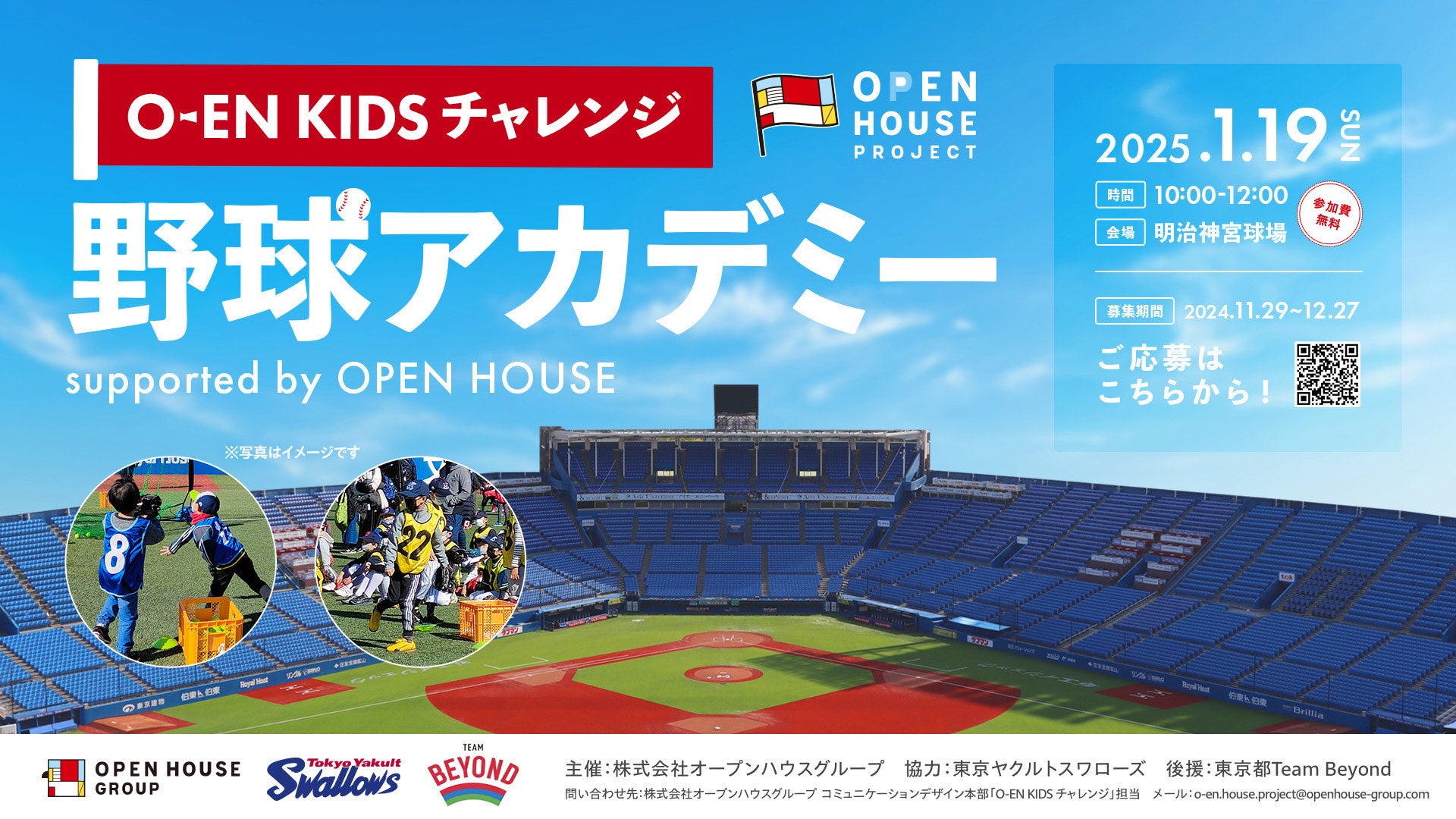 株式会社オープンハウスグループ(本社 東京都千代田区、代表取締役社長 荒井正昭、以下「当社」)は、当社の企業姿勢である「挑戦する人や組織を応援する」を目的に、挑戦したいが、様々な背景から挑戦する機会や環境がない子供達に向けて、現状から前進するためのきっかけ・機会の提供を通して応援するべく、2025年1月19日(日)に、第1回「O-EN KIDS チャレンジ - 野球アカデミー supported by OPEN HOUSE」を明治神宮野球場(新宿区霞ケ丘町3-1)にて開催いたします。